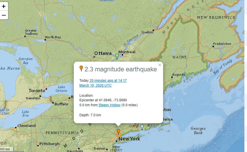 A 2.3 magnitude earthquake was recorded at 10:17 AM near Sleepy Hollow and Tarrytown in Westchester County, approximately 20 miles north of New York City. Earthquakes of this size typically cause no damage, though some residents in nearby areas including the Bronx reported feeling the tremor.